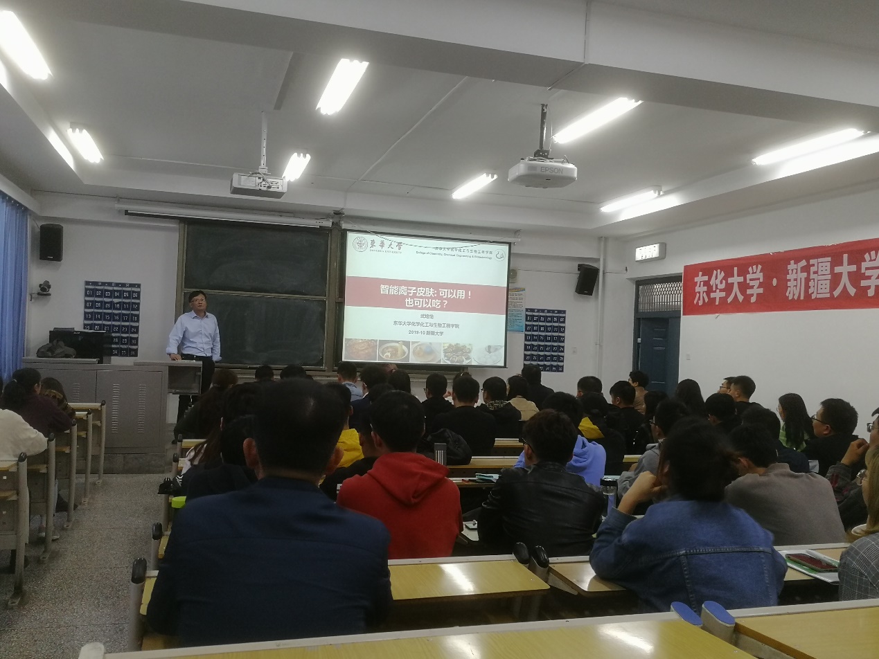 10月14号下午武院长为新疆大学纺织与服装色漫天堂 师生作了一场“智能离子皮肤:可以用!也可以吃?”的学术报告。报告首先以大家熟悉的新疆拌面和馕等日常面食品为例,分析了这些美食制作后面的科学道理,一下子就强烈吸引住了师生们的注意力。接着循序渐进地介绍了目前智能高分子材料的应用进展,深入浅出地报告了他自己课题组所取得的最新研究工作成果,分享了自己的科研心得和经验,风趣幽默的语言、精彩的演讲和渊博的知识赢得了师生们的阵阵掌声。报告会后还进一步与师生们进行了广泛交流。