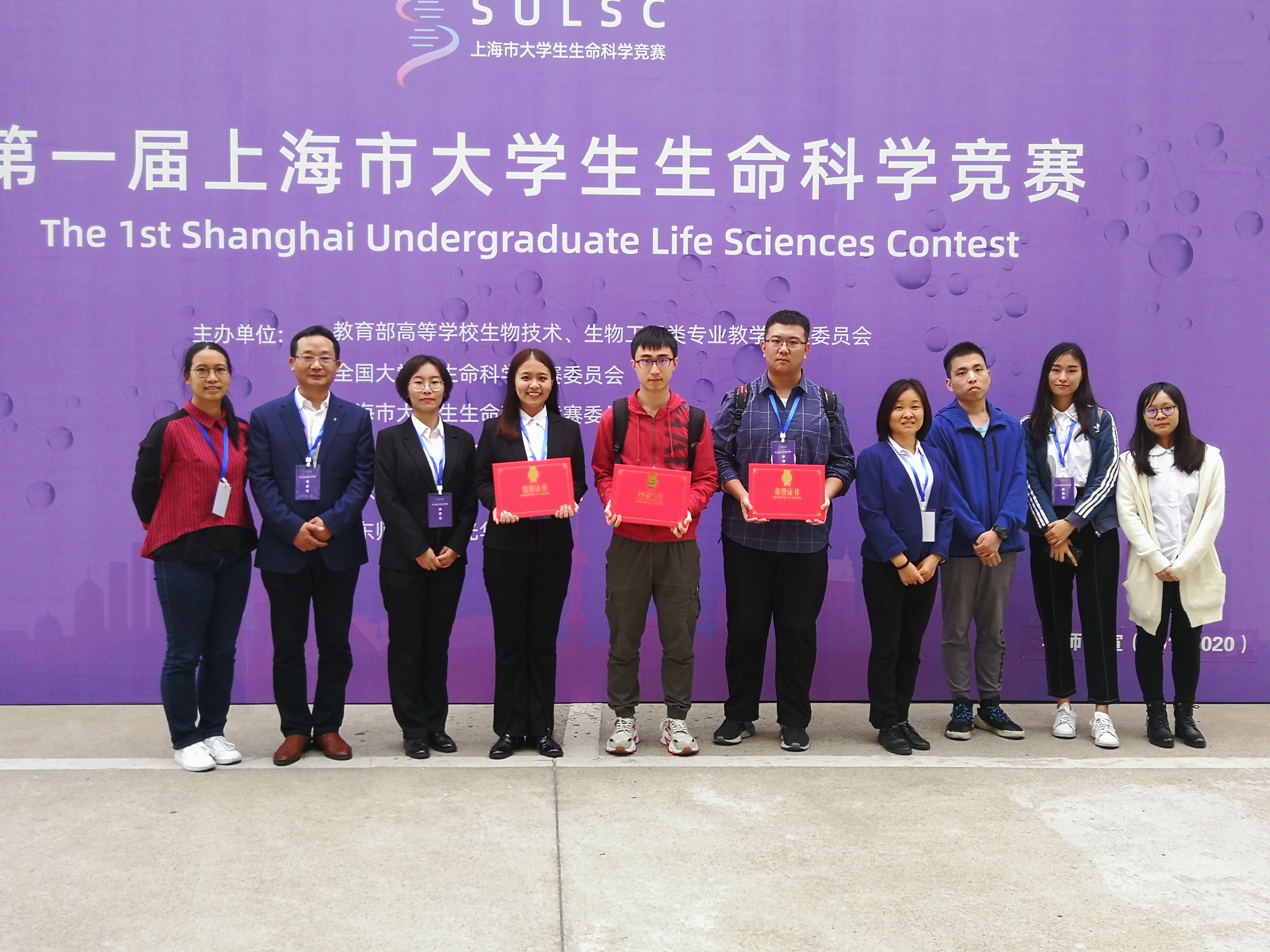 10月26日在第一届上海市大学生生命科学竞赛中,我院本科生游燕玲团队荣获第一届上海市大学生生命科学竞赛特等奖,何创龙教授获得优秀指导教师称号。