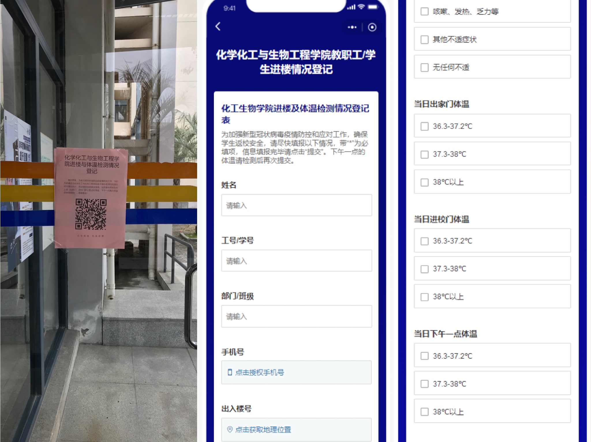 一、严格执行大楼出入登记和体温监测制度。在三号色漫天堂 楼、生物楼及化学实验楼各大楼门口,贴了在线扫码登记的二维码,所有师生出入大楼均扫一次二维码登记,错峰出入,出家门、进校门、午后一点三次测体温,通过支部书记实施监控上报,一切都有条不紊地进行着。