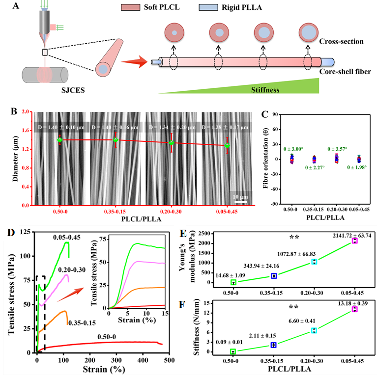图1 基于单根纤维壳芯厚度调控策略,采用SJCES技术制备四种不同刚度的取向纤维:A)SJCES技术制备刚度可调的壳芯结构取向纤维示意图;B)取向纤维的直径无显著性差异;C)取向纤维的取向度无显著差异;D)取向纤维的拉伸应力-应变曲线;E)杨氏模量分析;F)刚度分析(改变芯层PLLA含量可使复合纤维的刚度调控范围近150倍)