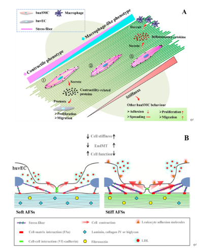 基于上述取向纤维,课题组首先探索了取向纤维刚度对人脐动脉平滑肌细胞(huaSMCs)功能表达的影响。结果证实,取向纤维刚度的变化对细胞形貌无显著性影响,但却促进了huaSMCs中F-肌动蛋白应力纤维的形成,导致细胞增殖和迁移能力的增强,细胞表型向合成型、病态表型转变(如收缩型标志物a-SMA、SM-MHC、Calponin和Desmin表达下调,病变型标志物OPN表达上调)。同样,刚度过高的取向纤维也会促进huaSMCs由收缩型向类巨噬细胞表型转变,分泌炎症因子募集炎症细胞(如白细胞和巨噬细胞),破坏内皮细胞的完整性和促进SMCs的过度增殖,造成血栓形成和内膜增生的发生(图2A)。从材料选择角度看,该研究结果也表明,虽然电纺PLLA纤维的微纳米尺寸能够赋予支架一定的柔软性,但与弹性的PLCL相比,PLLA并不是构建血管组织工程支架的最佳材料选项。重要的是,论文结果强调血管细胞的形态‘正确’并不意味着其具有‘正确’的细胞功能这一重要研究结论,虽然有较多研究证明高度有序的血管细胞层更有利于维持细胞的功能表达。