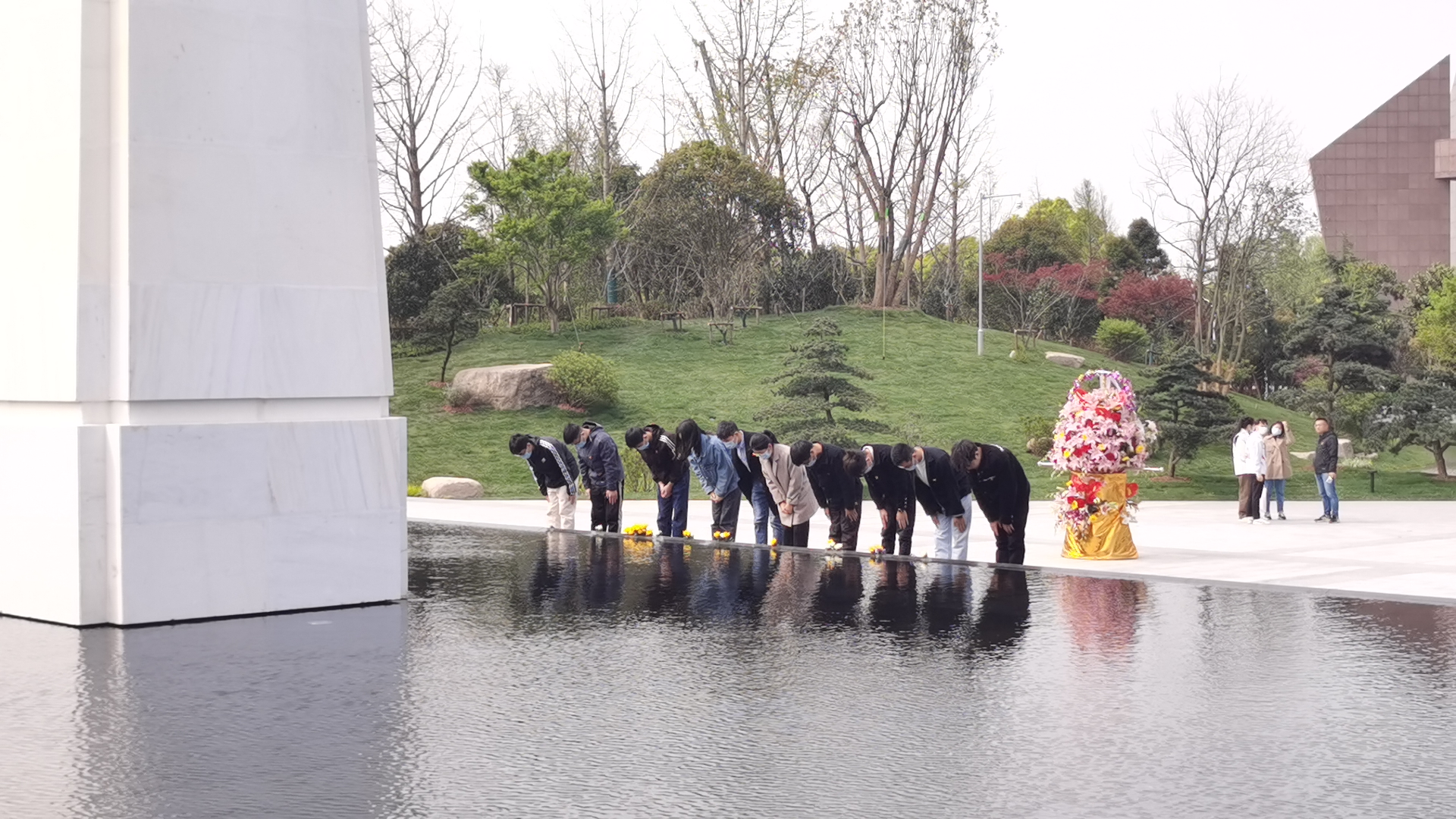 烈士陵园内,松柏苍翠,庄严肃穆。烈士墓广场石梯中间的五星红旗和党旗迎风飘扬,烈士纪念碑屹立在广场中央,传递着革命英烈勇毅顽强、战斗不息的革命精神。全体成员肃立在烈士陵园纪念碑前向革命先烈们默哀致敬,党员代表敬献花蓝。随后,在全国首个消防烈士纪念园前,全体成员缓步绕行,瞻仰消防英烈纪念碑,依次走到生命柱前,献上手中鲜花,仔细瞻仰纪念碑,聆听先烈的英勇事迹,感受伟大的英雄精神。